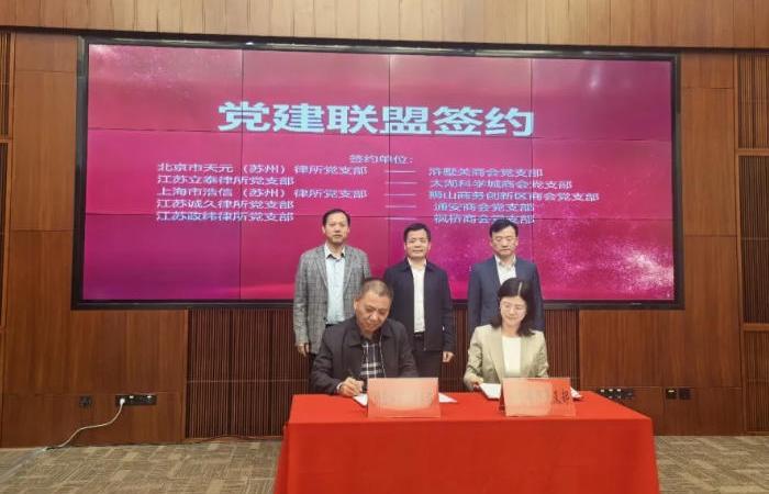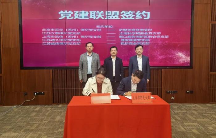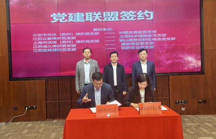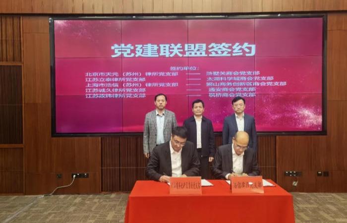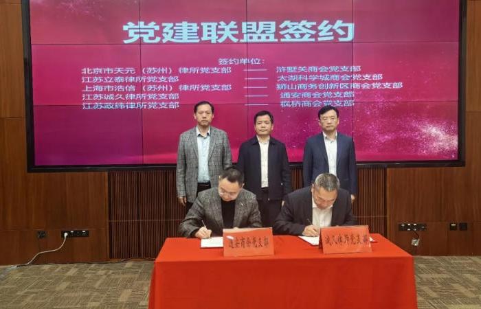 现场举行了党建联盟签约仪式,北京市天元(苏州)律所党支部与浒墅关商会党支部、江苏立泰律所党支部与太湖科学城商会党支部,上海市浩信(苏州)律所党支部与狮山商务创新区商会党支部,江苏诚久律所党支部与通安商会党支部,江苏政纬律所党支部与枫桥商会党支部分别建立党建联盟,以党建引领法治护航,为企业发展提供坚强组织保障。
