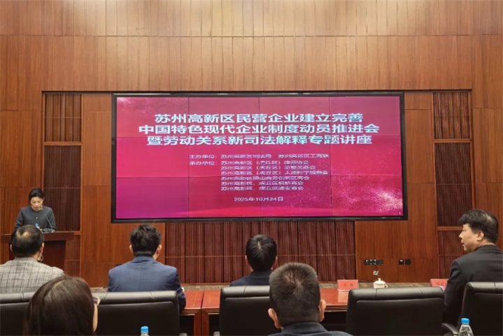 为深入学习贯彻习近平法治思想和习近平总书记关于引导民营企业建立完善中国特色现代企业制度重要指示精神,2025年10月24日下午,苏州高新区工商联联合区司法局共同主办民营企业建立完善中国特色现代企业制度动员推进会暨劳动关系新司法解释专题讲座。
