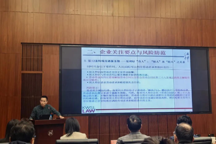 苏州大学王健法学院孙国平教授作《从竞业禁止、商业秘密看和谐劳动关系的构建》主旨演讲,从学术视角深入剖析新时代劳动关系的构建路径。在交流环节,江苏诚久律师事务所穆娜主任、江苏政纬律师事务所何欢欢律师以及北京市中闻(苏州)律师事务所许子成律师,围绕“当前劳动争议的主要原因及缓解之道”展开深入探讨。现场参会企业代表与各位律师针对新实施的《最高人民法院关于审理劳动争议案件适用法律问题的解释二》以及企业在经营过程中遇到的劳动纠纷问题进行了互动交流。